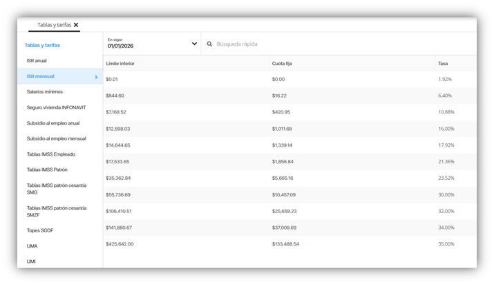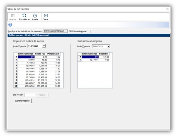 Al ingresar al menú Tablas -> Tablas del ISR Vigentes y seleccionar ISR / Subsidio mensual, podrás confirmar que contiene la nueva tarifa de ISR vigentes para 2026.