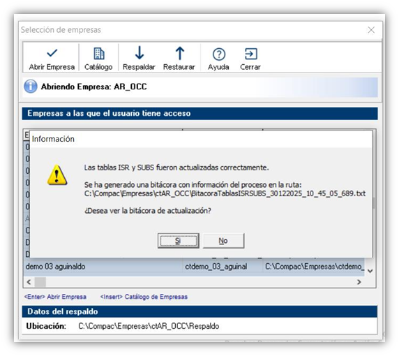 Al abrir tu empresa en CONTPAQi Nóminas® verás un mensaje indicándote que se realizó la actualización de las nuevas tarifas de ISR Mensual 2026.